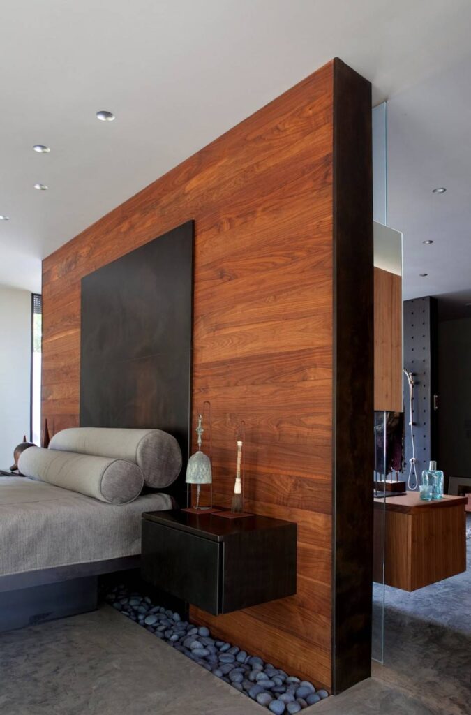• Headboard: Create a unique headboard by extending a wood feature wall to the ceiling.